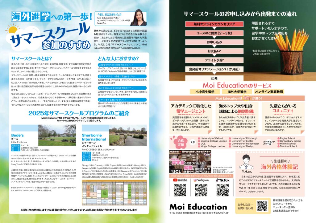 実際に私も留学を考えていた中学生の時にイギリスのボーディングスクールで開催されたサマースクールに参加し、それをきっかけに正規留学を決断しました!